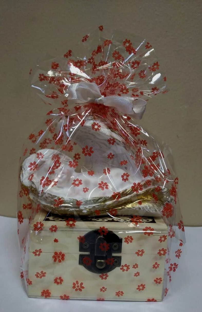 Rinkinį sudaro: gipsinis angeliukas, medinė papuošalų dėžutė su ornamentu – širdelė