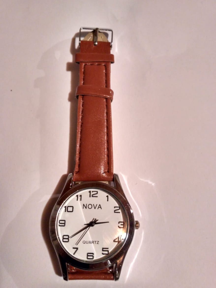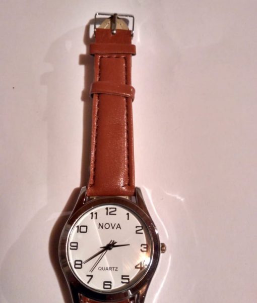 - Laikrodis sidabro spalvos korpusu, baltos spalvos ciferblatu. Šviesiai rudos spalvos apyrankė 24,7×1,7cm. Laikrodžio skersmuo 3,5cm.